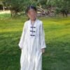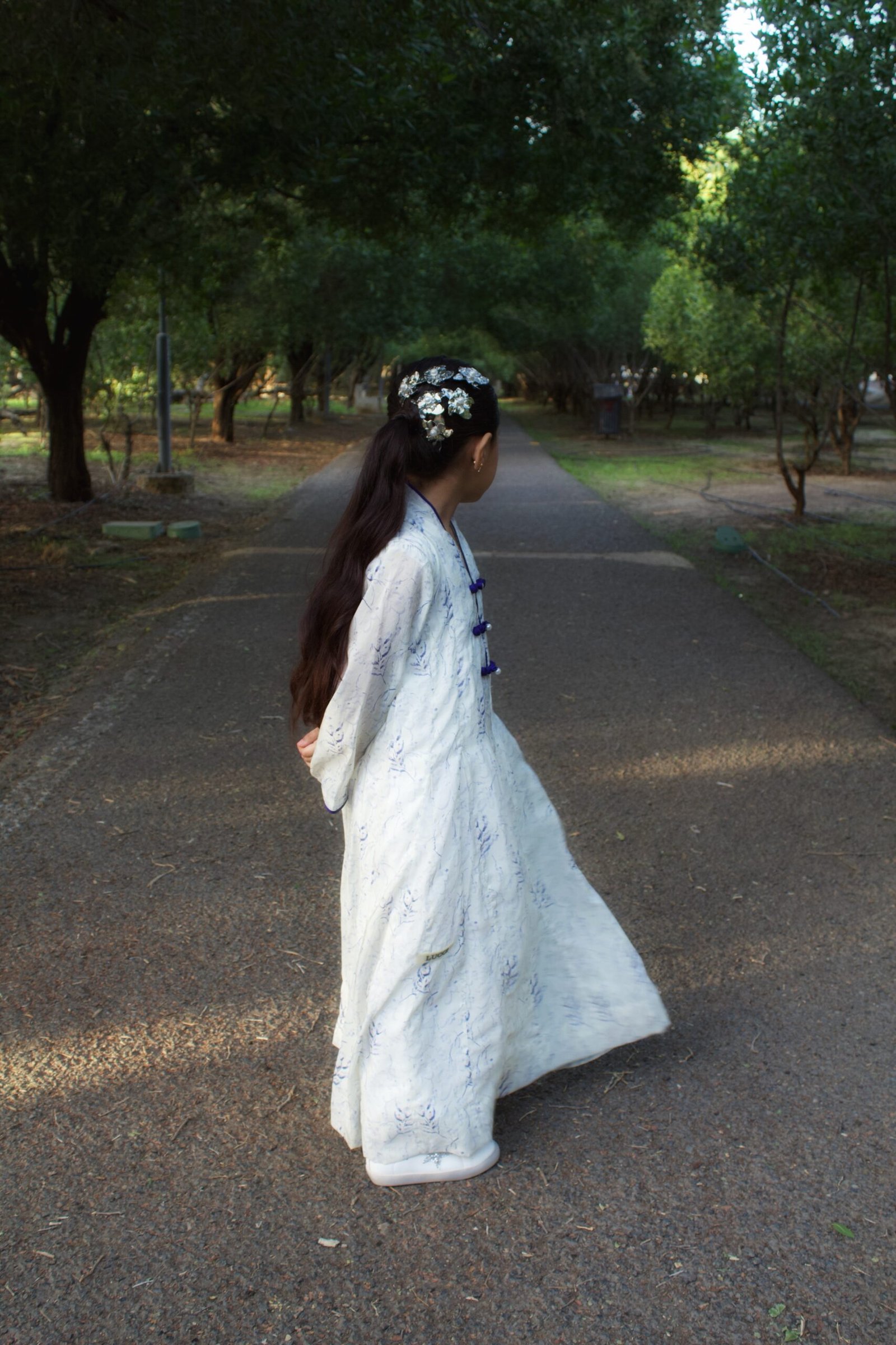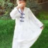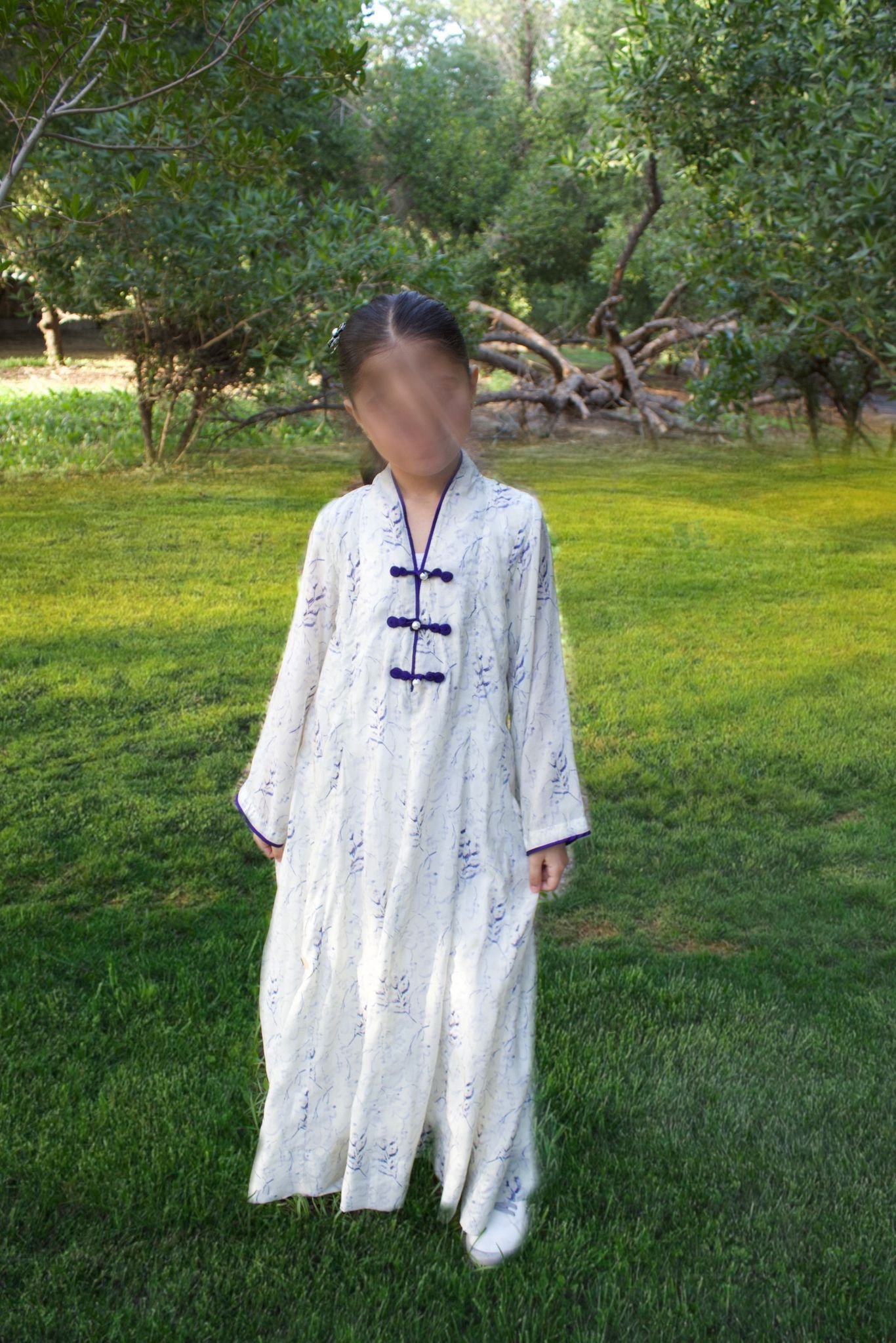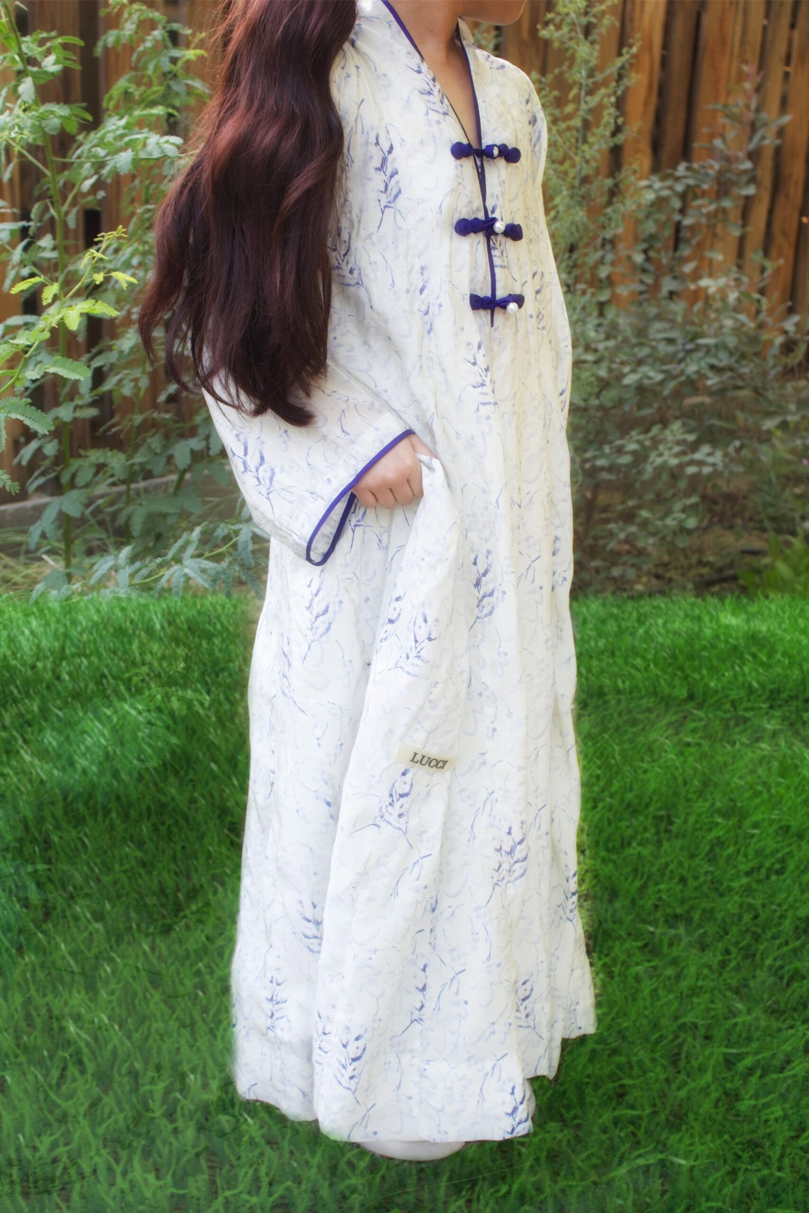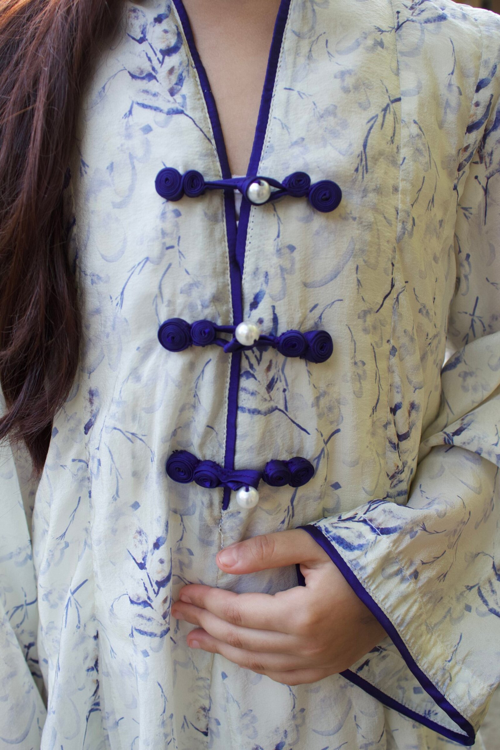 دراعة رمضانية بقصّة كلوش كاملة، مصمّمة بقماش حرير فاخر بنسيج طبيعي،مع قصّات طولية (Panelled cut) تبدأ من الأعلى وتزداد اتساعًا من الأسفل. الأكمام بقصّة Bell واسعة، محاطة بريم بلون الازرق يبرز الأطراف. التصميم مزوّد بأزرار أمامية من نوع Frog buttons، مناسبة للأطفال ولمناسبات رمضان، غير قابل للتعديل والتبديل والاسترجاع لا يتوفر مخزون الرجاء التاكد من جدول المقاسات قبل الطلب بالنسبه للام يرجى كتابة المقاسات كامله .